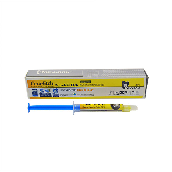 اسید هیدروفلوئوریک 9% مناسب براى اچینگ سطح روکش هاى سرامیکى و پرسلنى آماده سازى سطح پرسلن به منظور باند قویتر با رزین و کامپوزیت اچ پرسلن ونیر، کراون، اینله هرجعبه حاوى یک سرنگ 3 میلى لیترى